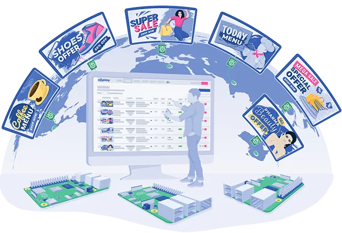 1Play Digital Signage is a cloud application available as a prepaid service. Connect one Raspberry Pi to each TV through an HDMI cable, and then through the 1Play cloud dashboard you can transmit any type of media file to the screens. In this way, you can manage any number of TV screens you have, from anywhere, immediately and easily.